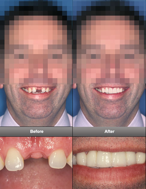 This gentleman was referred in for replacement of his failing bridgework, previously fitted to replace his upper right central incisor tooth. Both abutments were severely damaged and therefore removed and replaced with two implants and then the bridge was replaced with implant-supported aesthetic bridgework.